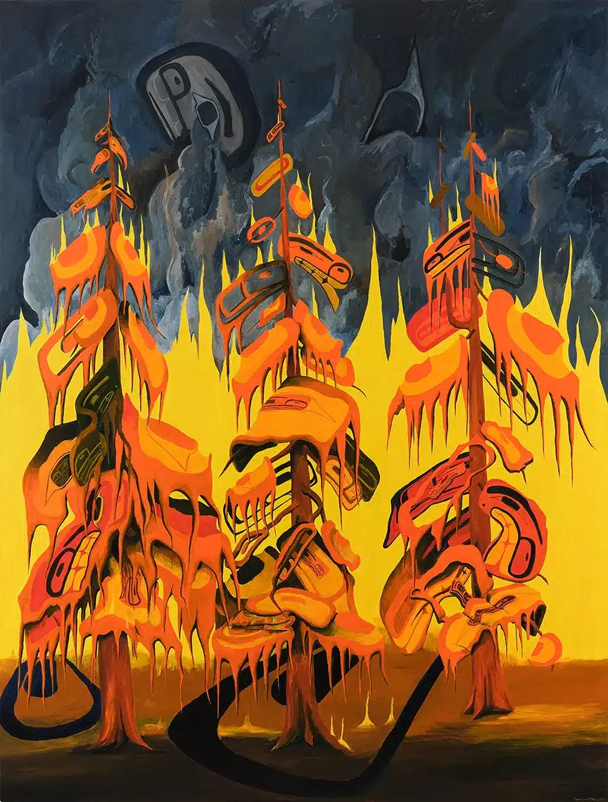 Lawrence Paul Yuxweluptun Lets’lo:tseltun is one of Canada’s most outspoken and influential contemporary artists, confronting colonial suppression, environmental degradation, and the ongoing struggles for Indigenous sovereignty. Of Cowichan (Hul’q’umi’num Coast Salish) and Okanagan (Syilx) descent, his forty-year practice brings together traditional iconography, fearless critique, and biting satire to challenge and unsettle. Floor Opener presents a selection of works that are at once polemical and playful, imbued with a spiritual resonance that speaks urgently to the political and social realities of our time. This nationally significant exhibition is organized and circulated by the Kitchener-Waterloo Art Gallery, with artwork sourced from private collections in British Columbia.