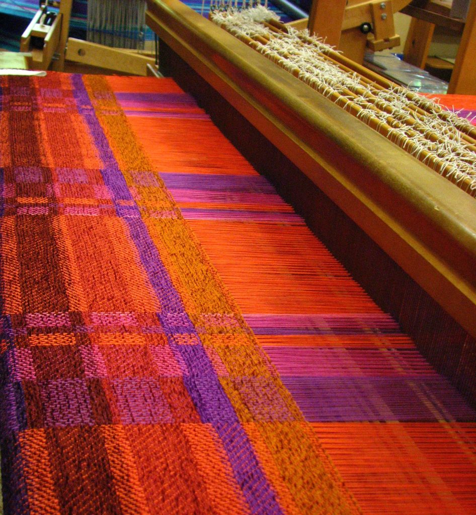 A short path through the woods and find walls of coloured yarn in Barefoot Handweaving.  Thick straw bale walls enable the weavers to use bare feet while treadling ‘musical’ weaving patterns on hand looms. Try on a twisted shawl, hat or a bag. Home of Ted Wallace paintings.