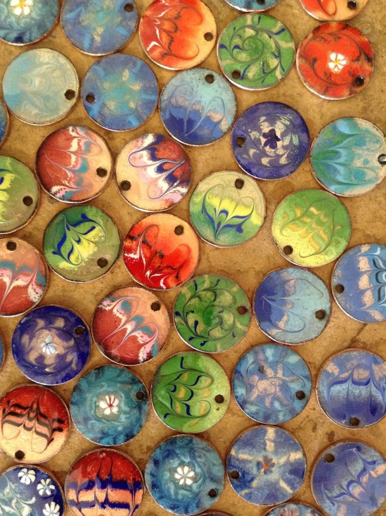 Coming into the Forge and Furnace Gallery, the clanging of hammers hitting iron is like bells.   Kootenay Forge ironwork and FireWorks Enamelled Copper use serious heat. Products range from decorative iron racks and fireplace sets to hooks. Colourful enamelled wall pieces to earrings.