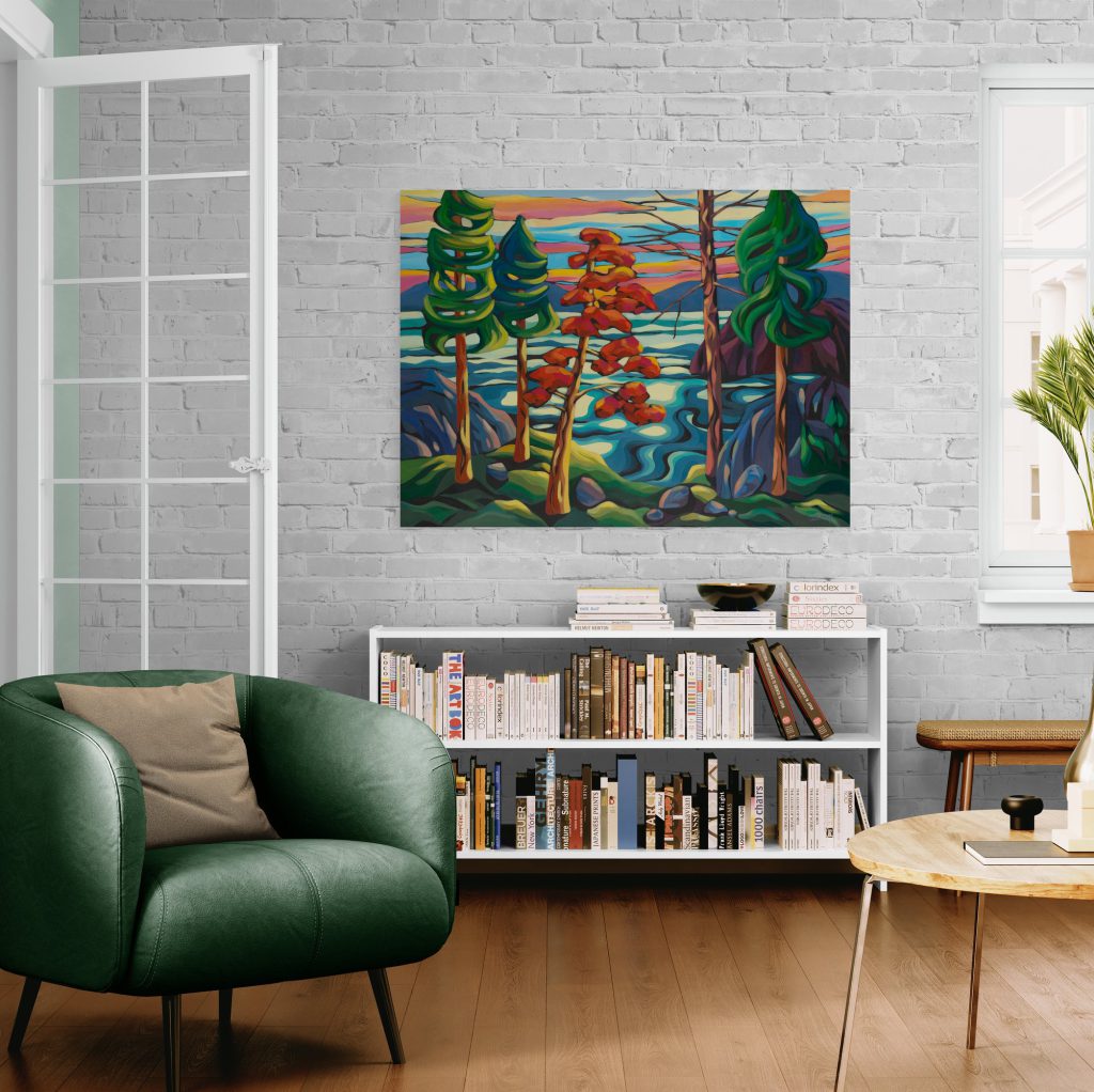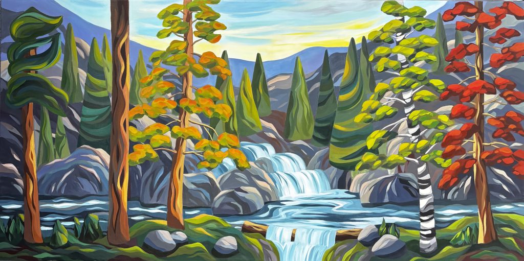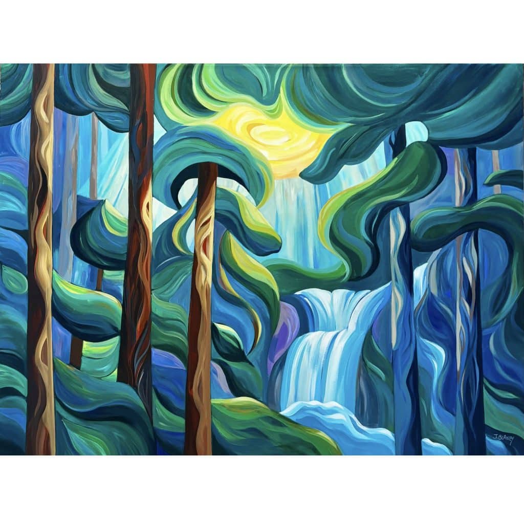 Contemporary Canadian West Coast artist Jodie Blaney creates expressive, joy-filled paintings inspired by the landscapes of British Columbia. Drawing from forests, mountains, and shorelines, her imaginative work is defined by vivid colour, rhythmic composition, and simplified, flowing shapes. Each piece evokes a sense of movement and immersion while maintaining a strong sense of harmony and balance.