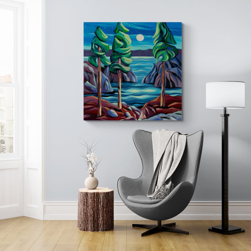 An established artist with over 15 years of experience, Blaney’s work is collected across Canada and internationally. Her paintings bring a sense of playful energy and calming presence into everyday spaces. Often featuring winding paths, stylized trees, and luminous light filtering through imagined environments, her work creates a feeling of quiet immersion. Through a distinctive visual language, she invites viewers into scenes that feel both familiar and dreamlike.