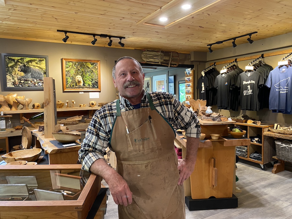 Built by Don Bastian this unique building features his wood artistry inside and outside. Seagulls, a whale, bear and cub, an ocean wave and a lighthouse are all depicted in the shingle siding. Metal fish, whales and other artwork are intertwined with boom chains, both inside and out, to bid a warm welcome to Telegraph Cove Gallery visitors. The Gallery boasts it’s own wood shop and pottery studio, along with artwork from local artists and the Boom Boat Suite, Telegraph Cove’s newest accommodation.